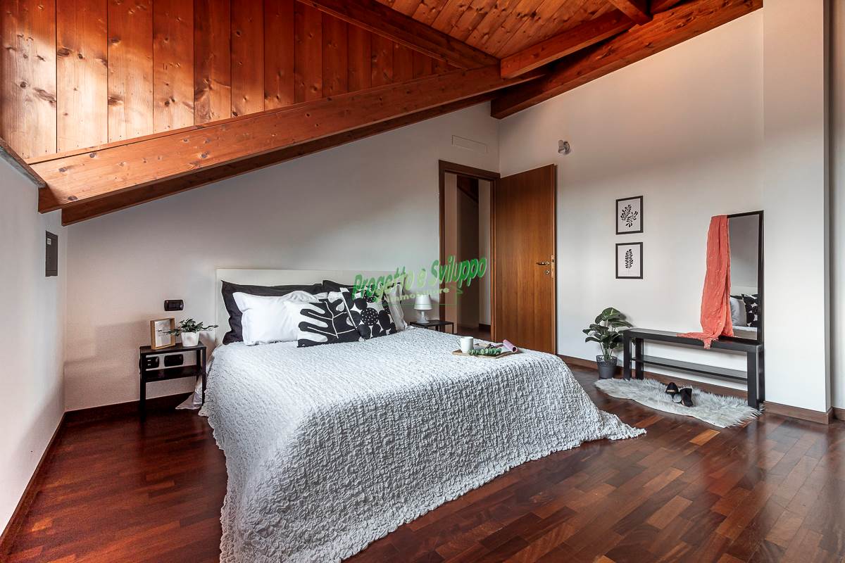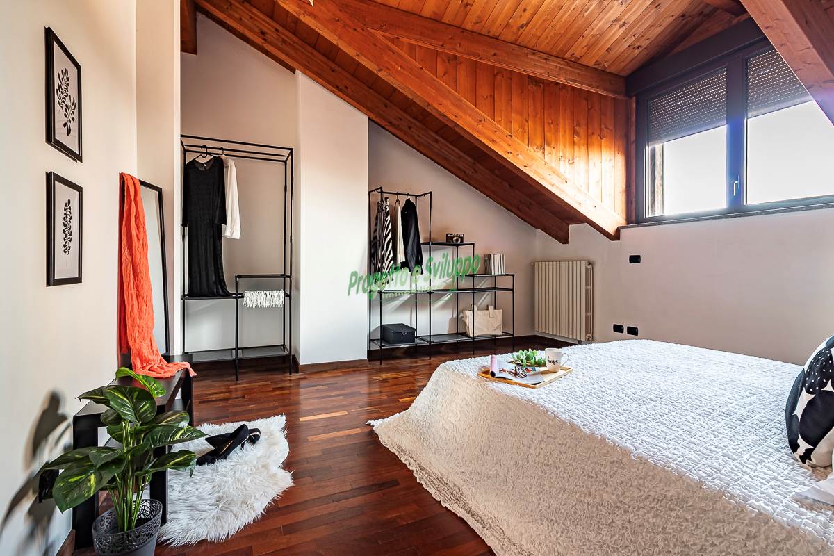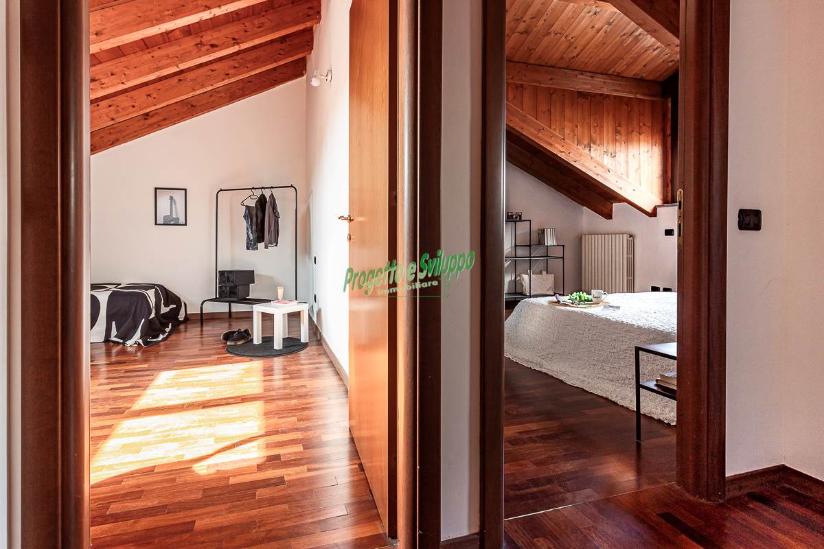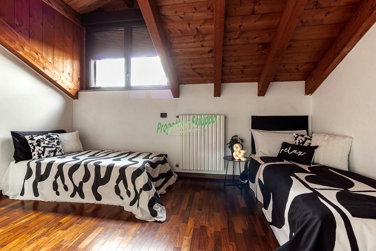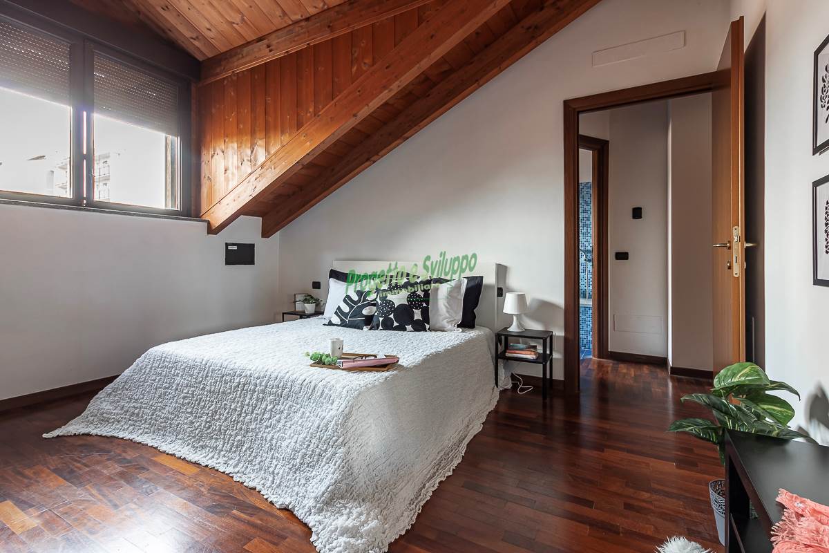Salendo all’ultimo piano, l’atmosfera cambia facendosi più intima e raccolta. Il soffitto con travi in legno a vista caratterizza l'intero livello, regalando calore alle due spaziose camere da letto e alla cabina armadio perfettamente organizzata. La sala da bagno è un’oasi di eleganza, dove il mosaico azzurro si sposa con sanitari sospesi e finiture di pregio.