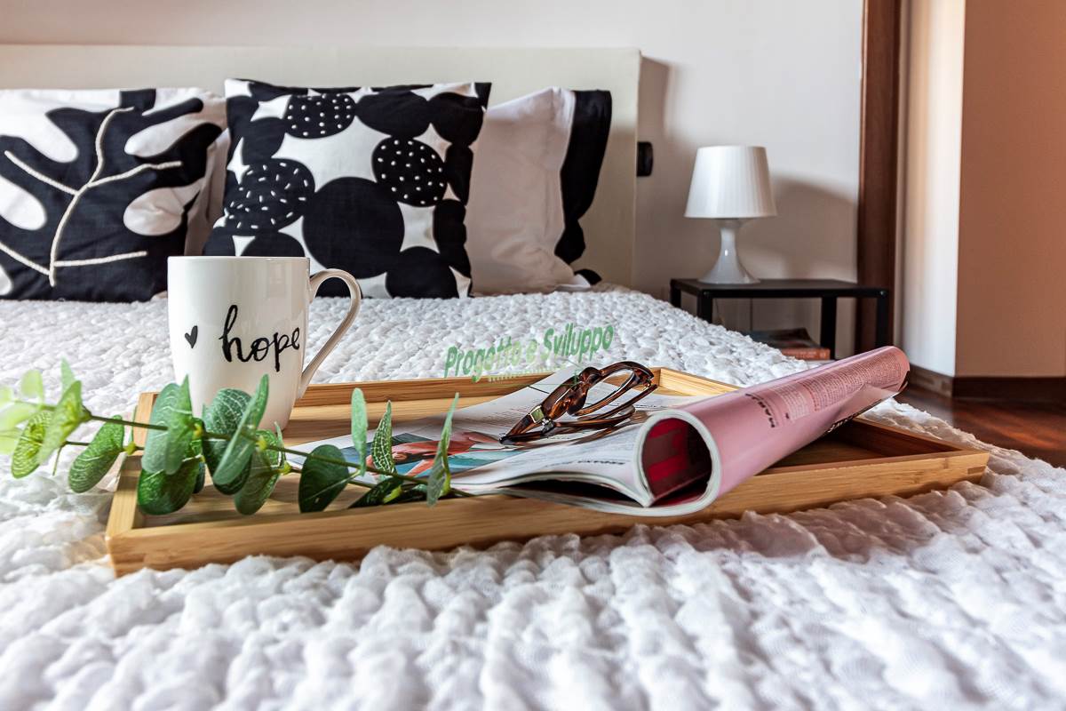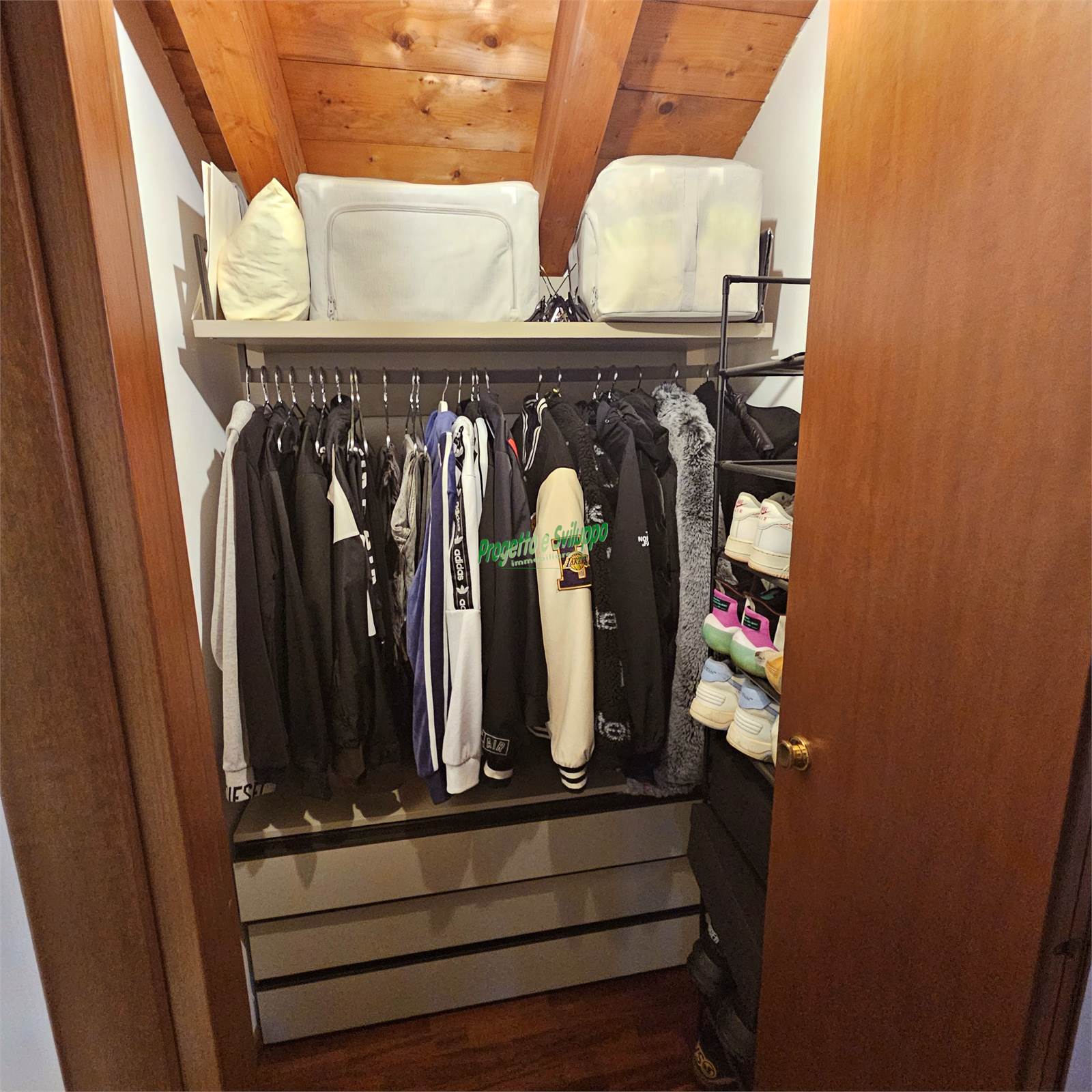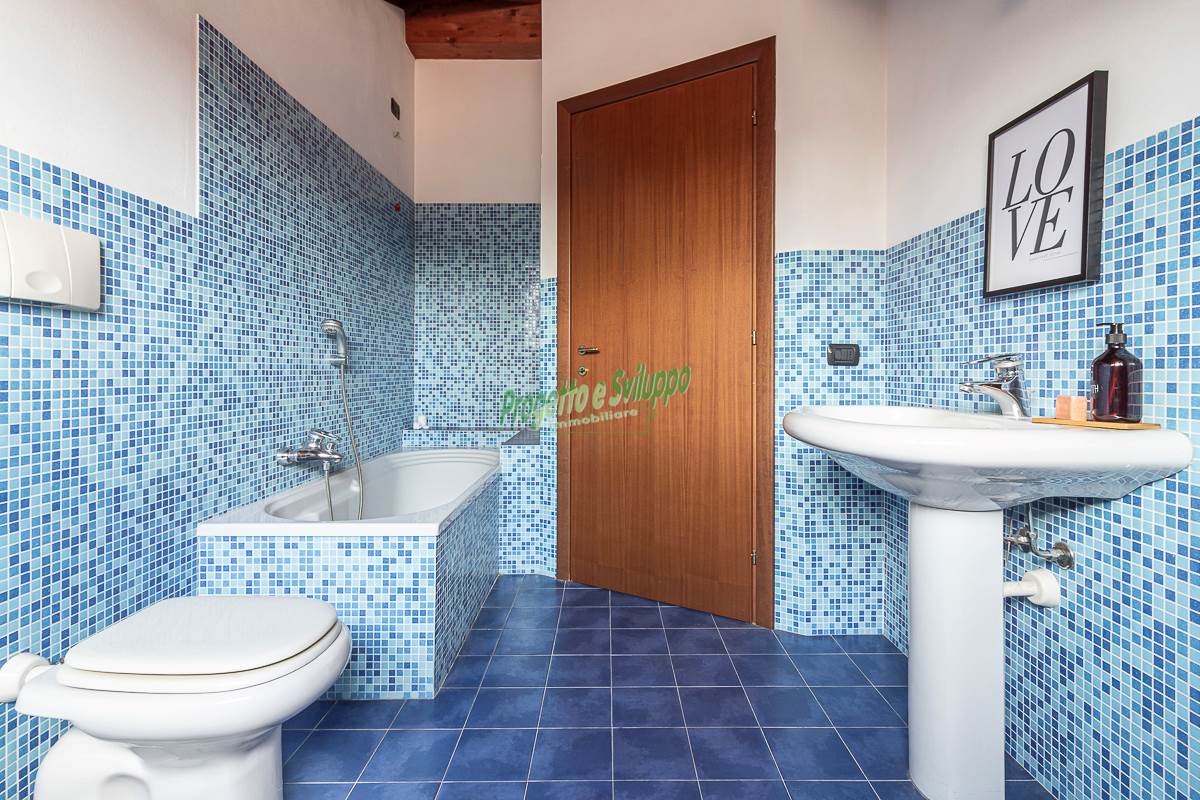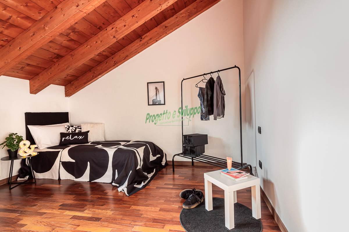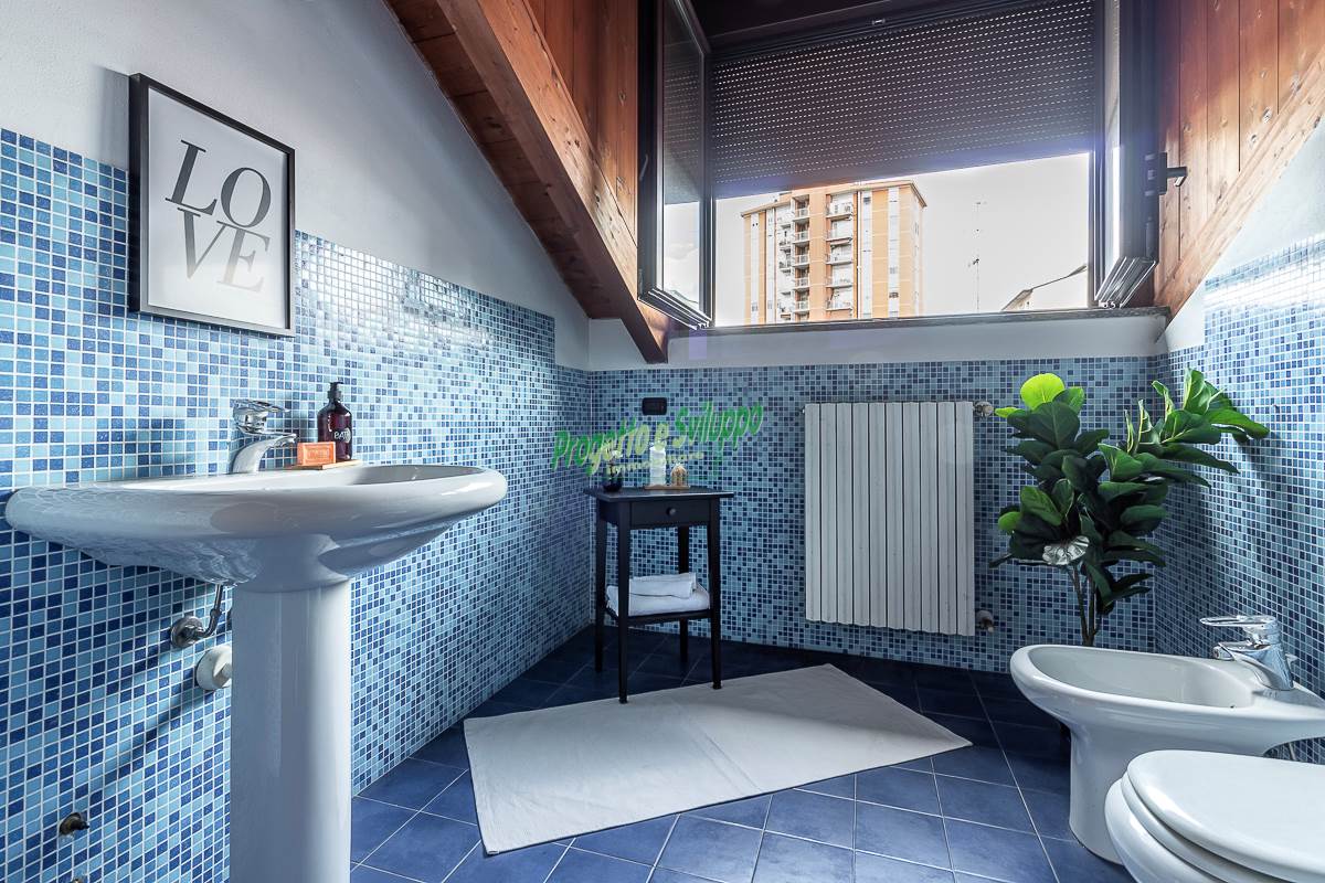 Salendo all’ultimo piano, l’atmosfera cambia facendosi più intima e raccolta. Il soffitto con travi in legno a vista caratterizza l'intero livello, regalando calore alle due spaziose camere da letto e alla cabina armadio perfettamente organizzata. La sala da bagno è un’oasi di eleganza, dove il mosaico azzurro si sposa con sanitari sospesi e finiture di pregio.