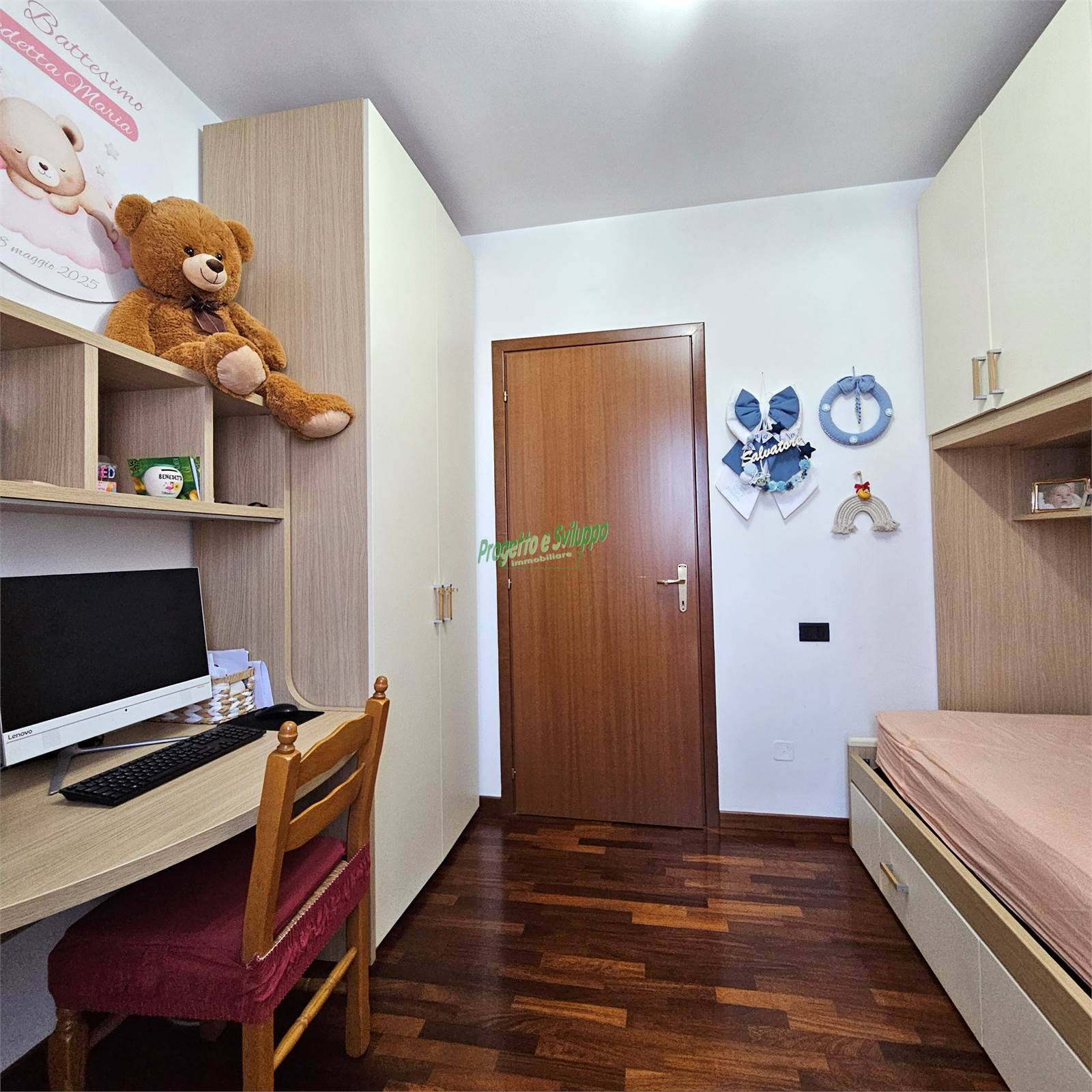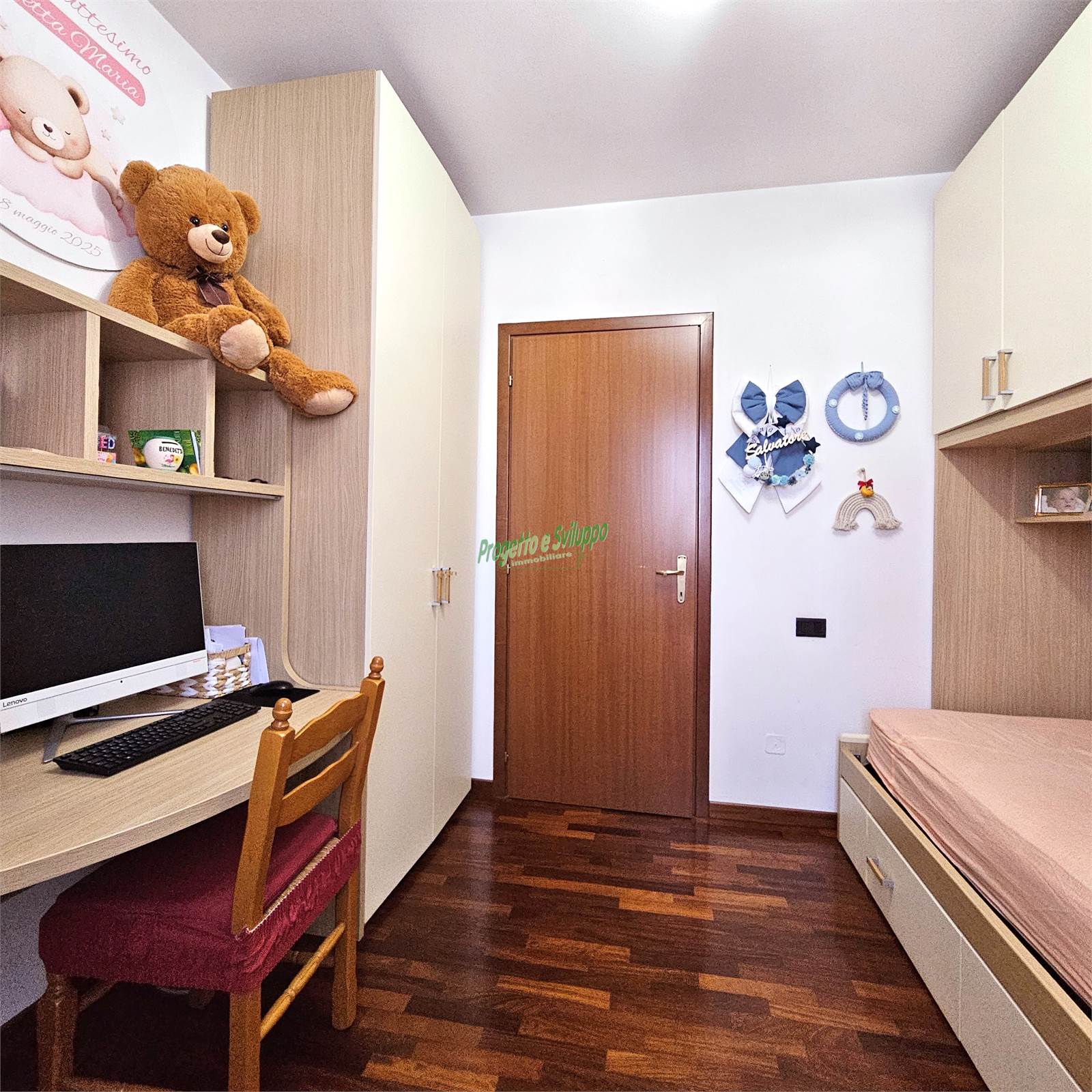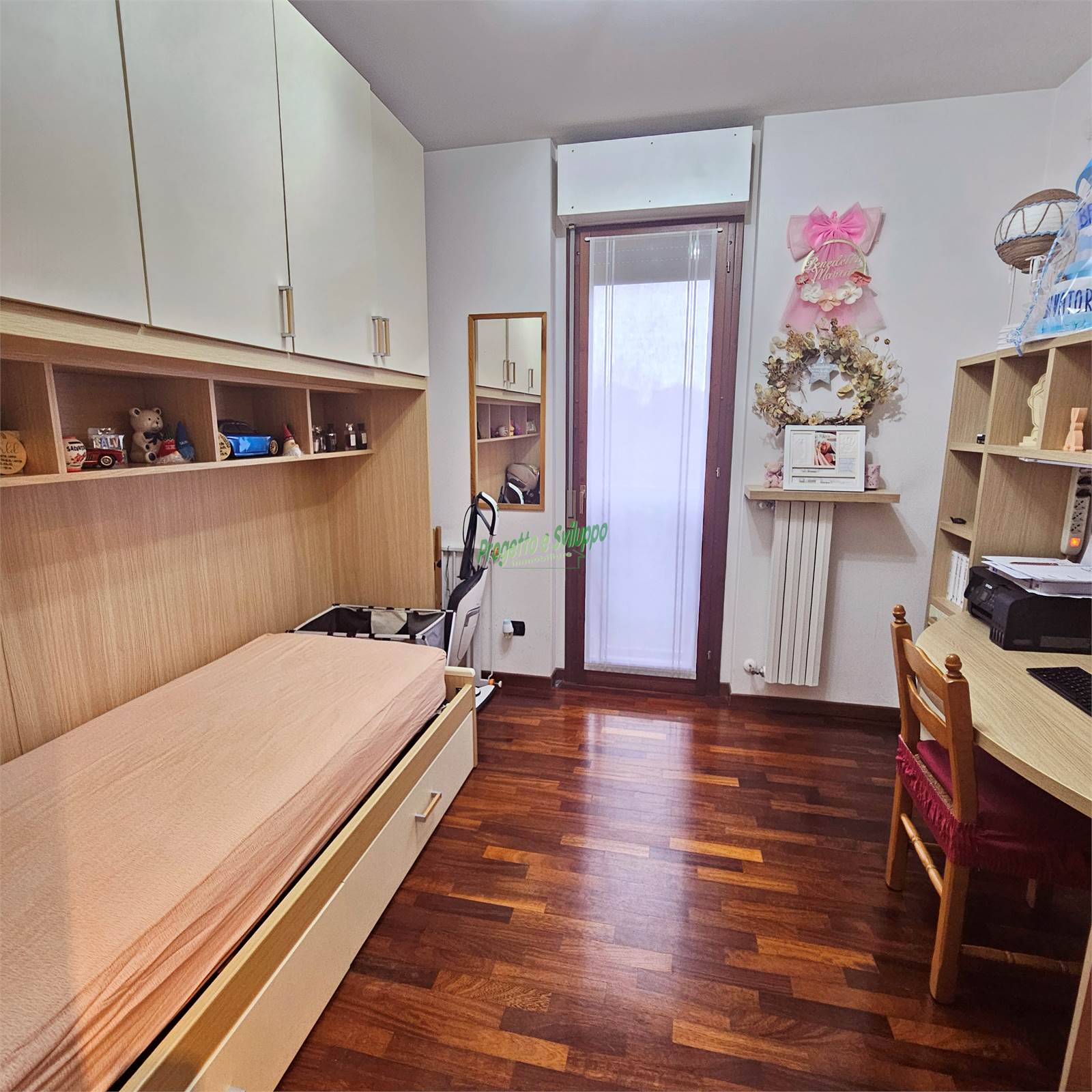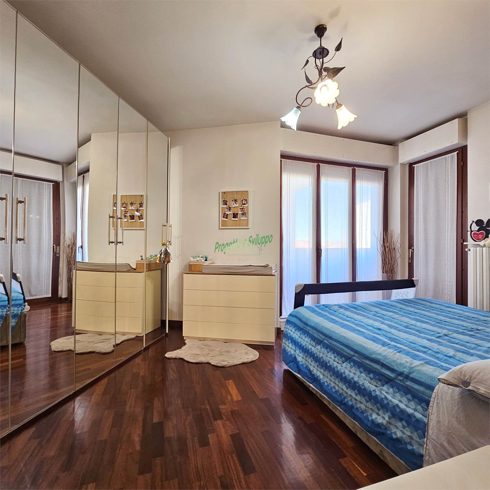 La zona notte ospita due camere da letto caratterizzate da ampie finestre, capaci di garantire un’eccellente luminosità e un costante ricambio d’aria. La camera padronale si distingue per una scelta moderna e di carattere: un’armadiatura disposta in diagonale che crea un interessante contrasto con le linee più classiche della zona giorno, conferendo personalità all’ambiente.