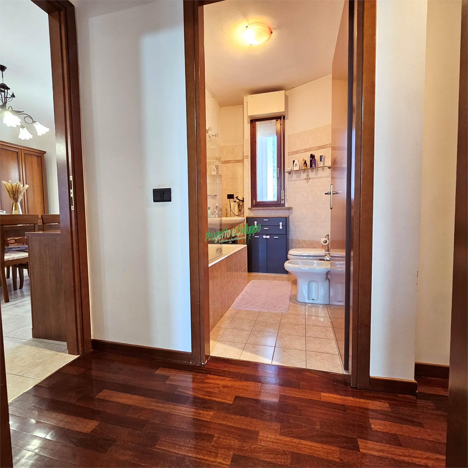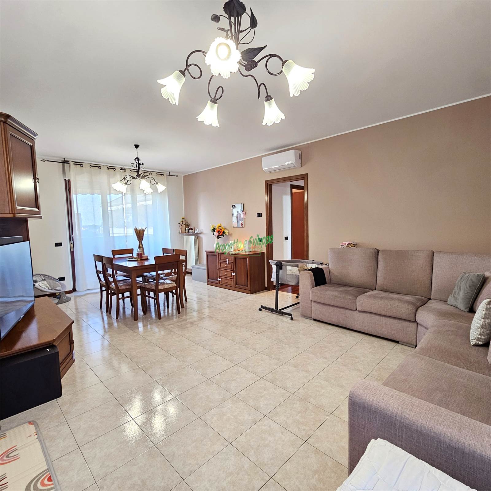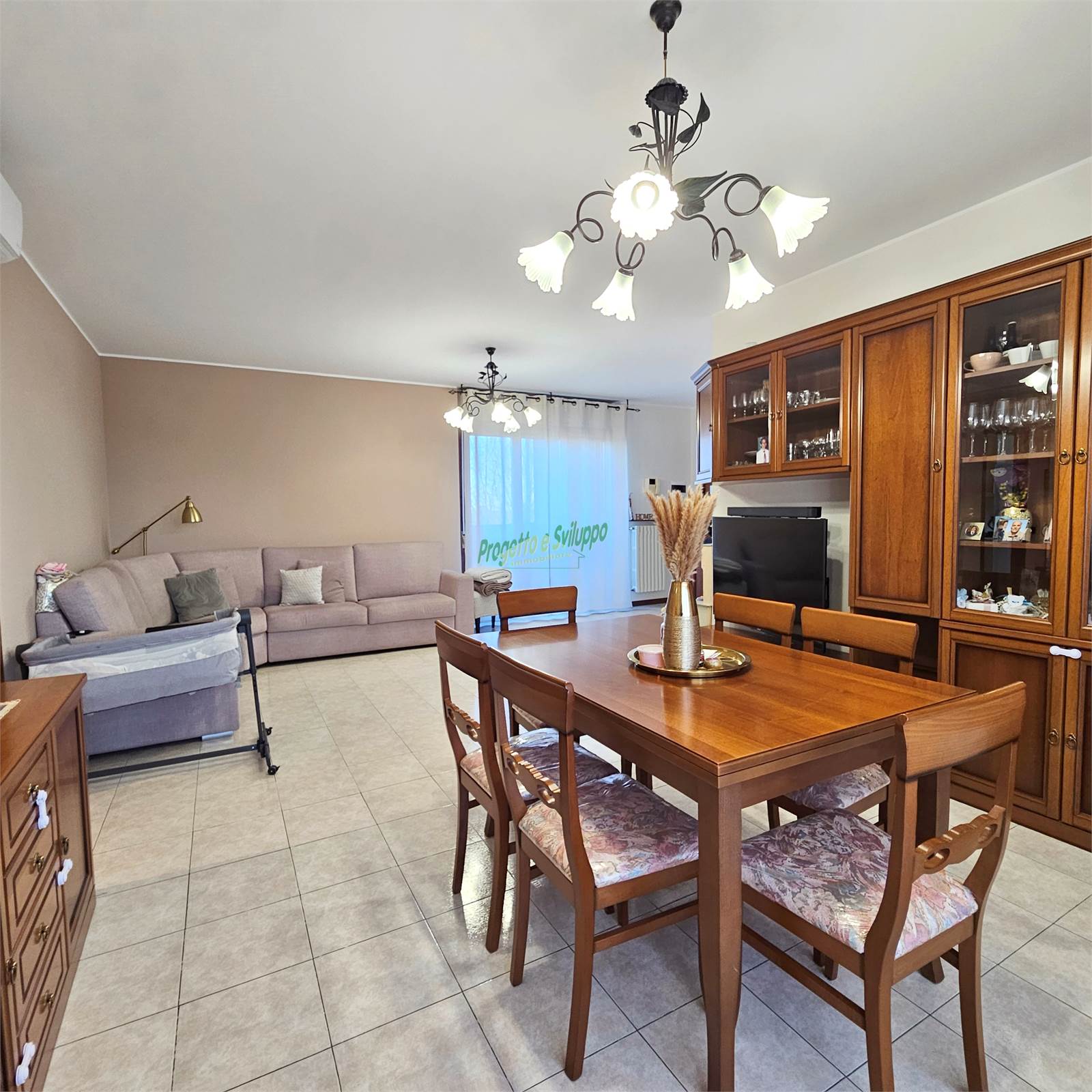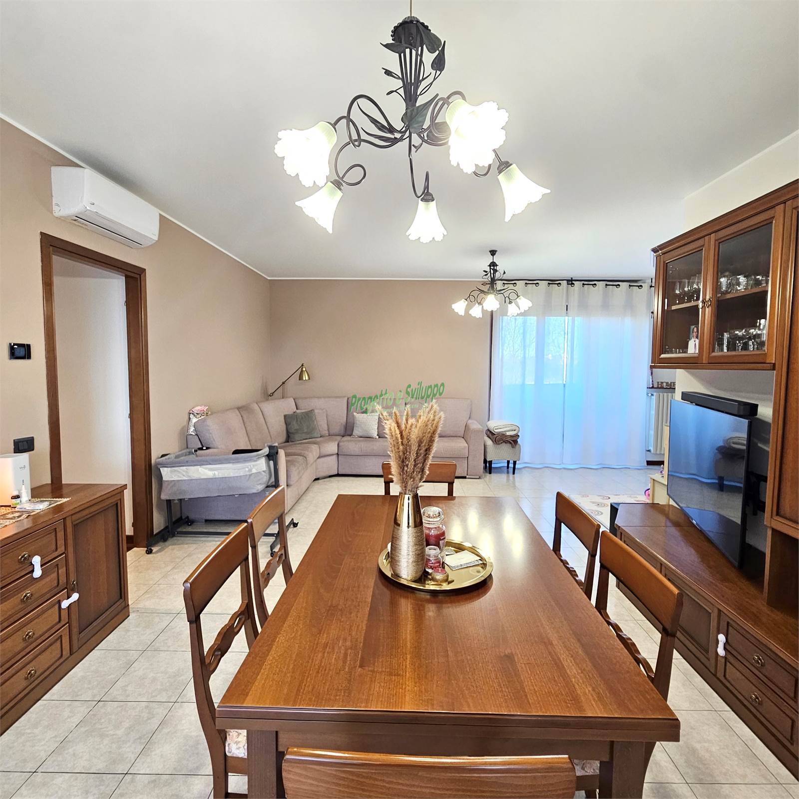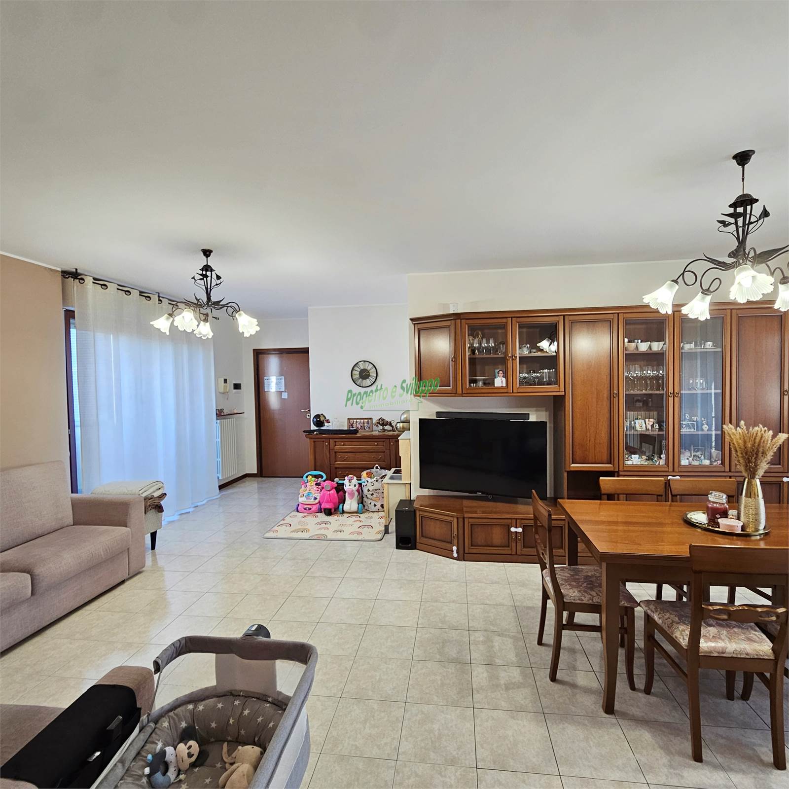 Gli ambienti sono accoglienti e dal gusto attuale, una soluzione che si rivela particolarmente adatta a giovani famiglie o a chi cerca spazi ben organizzati e luminosi. L’ingresso si apre direttamente sulla zona giorno, un ambiente di circa 30 mq che, grazie alla sua conformazione regolare, permette di distinguere con naturalezza l’area living dalla zona pranzo, mantenendo una piacevole continuità visiva.