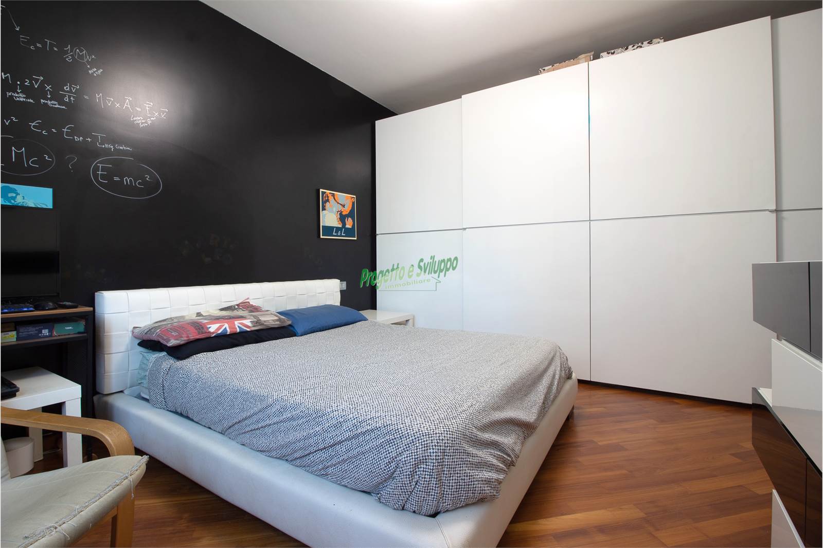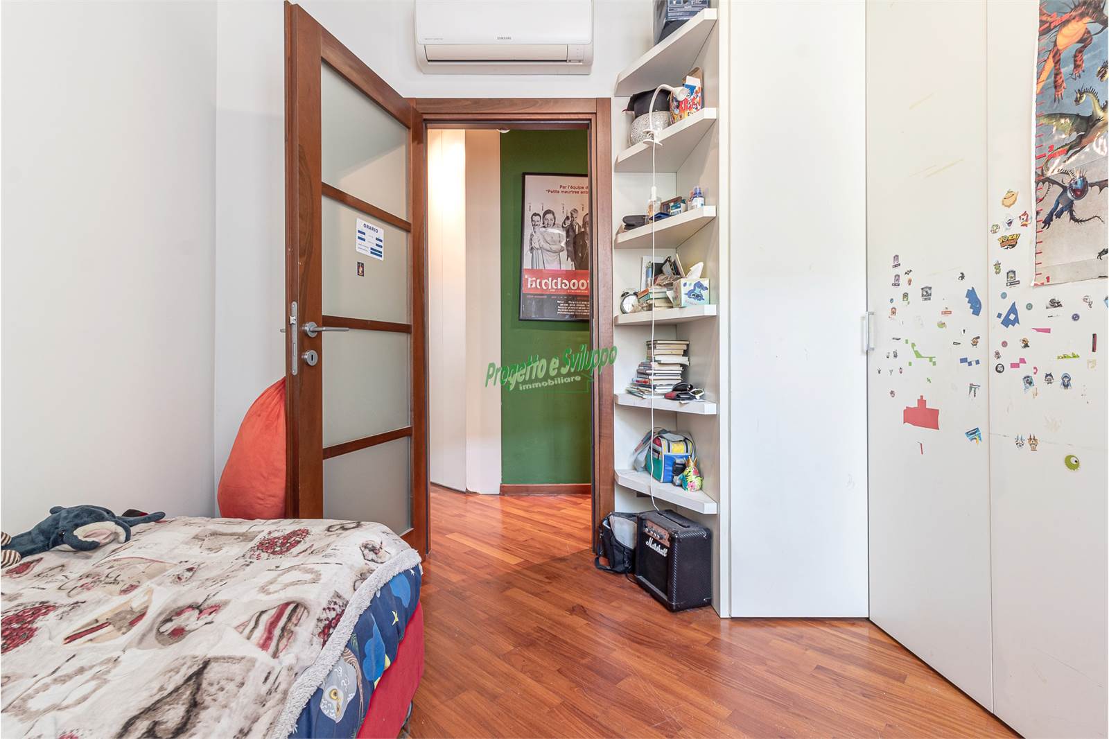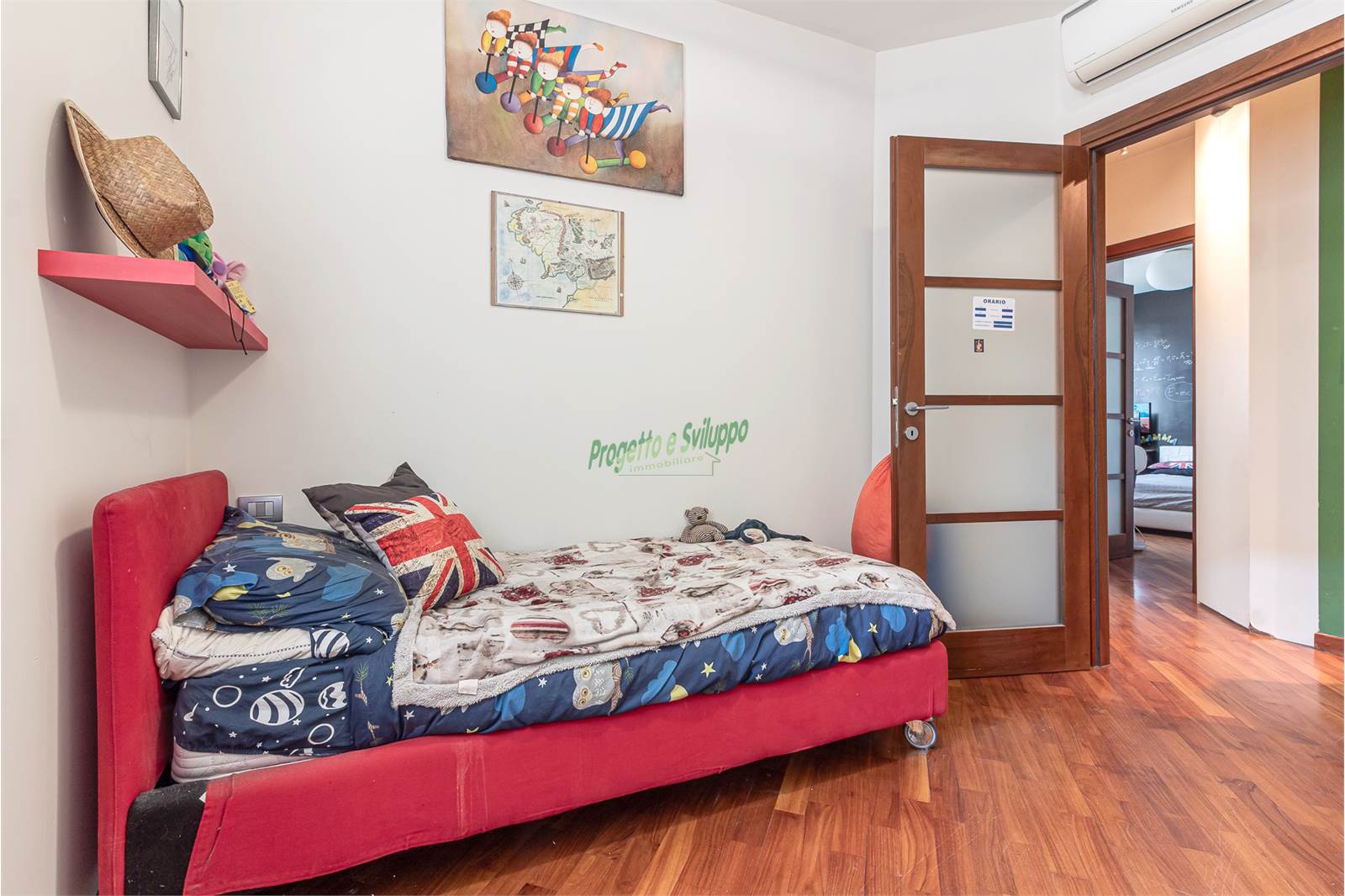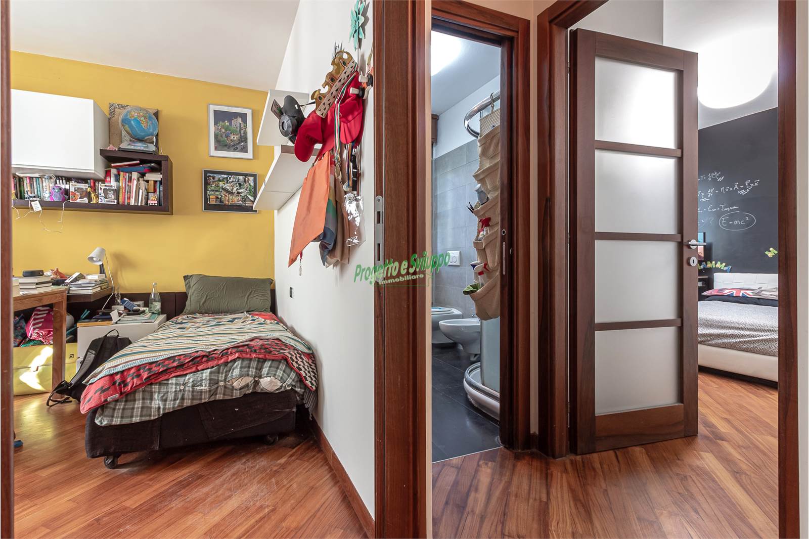 La distribuzione degli ambienti è razionale e studiata per garantire comfort e privacy. Un ampio disimpegno conduce alla zona notte, composta da due camere matrimoniali, una camera singola e due bagni, uno dotato di doccia e l’altro di vasca. Ogni spazio è stato valorizzato con attenzione, come dimostra l’armadiatura su misura nel disimpegno, perfetta per ottimizzare l’organizzazione della casa.