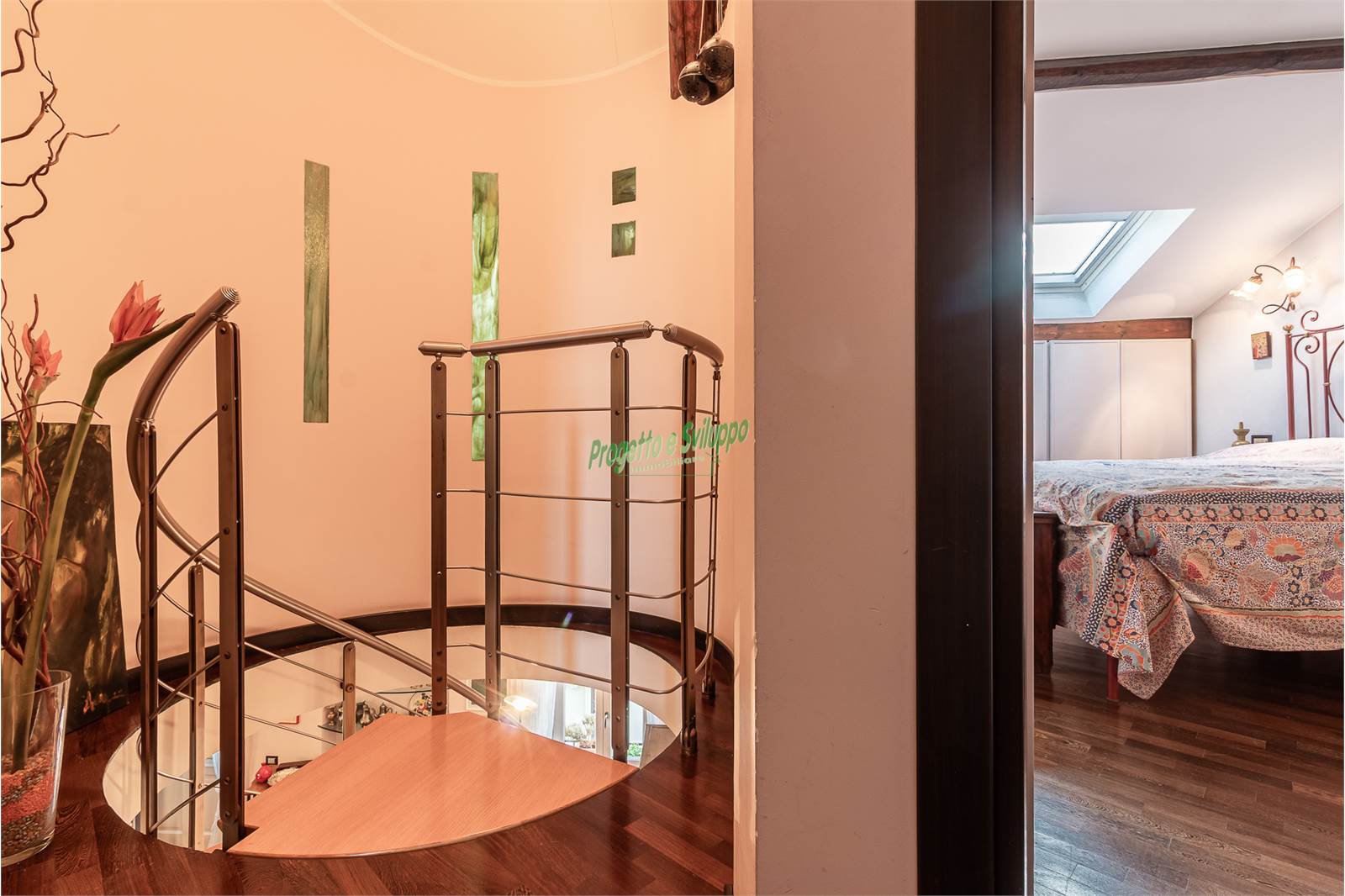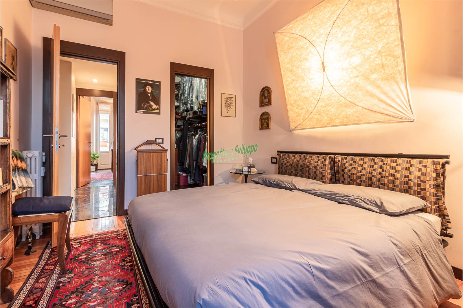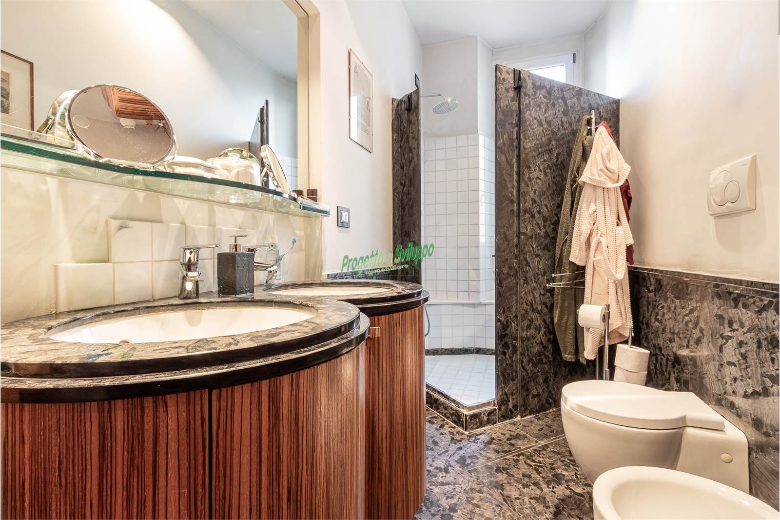 Al terzo piano, con altezze interne che raggiungono i 3,30 metri, si apre un ampio accogliente living impreziosito da parquet a lisca di pesce e dettagli in marmo di pregio, ambienti luminosi e accoglienti che dialogano armoniosamente con la cucina separata, ben organizzata e funzionale. La zona notte è ben distribuita e servita da un disimpegno con armadiature su misura che ottimizzano gli spazi contenitivi; completano il livello due camere da letto, di cui una con cabina armadio, un bagno finestrato e due balconi.